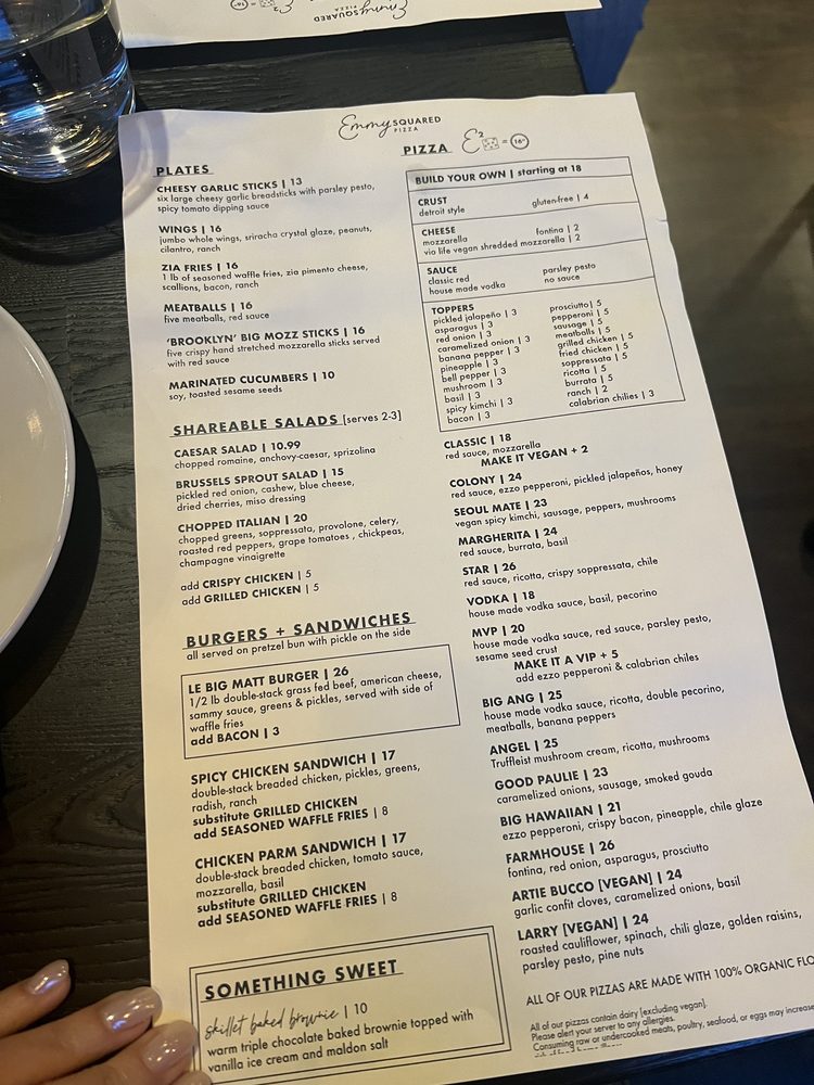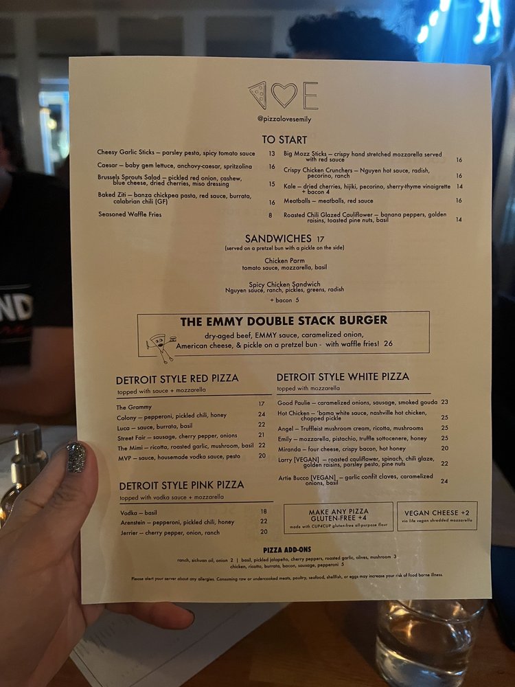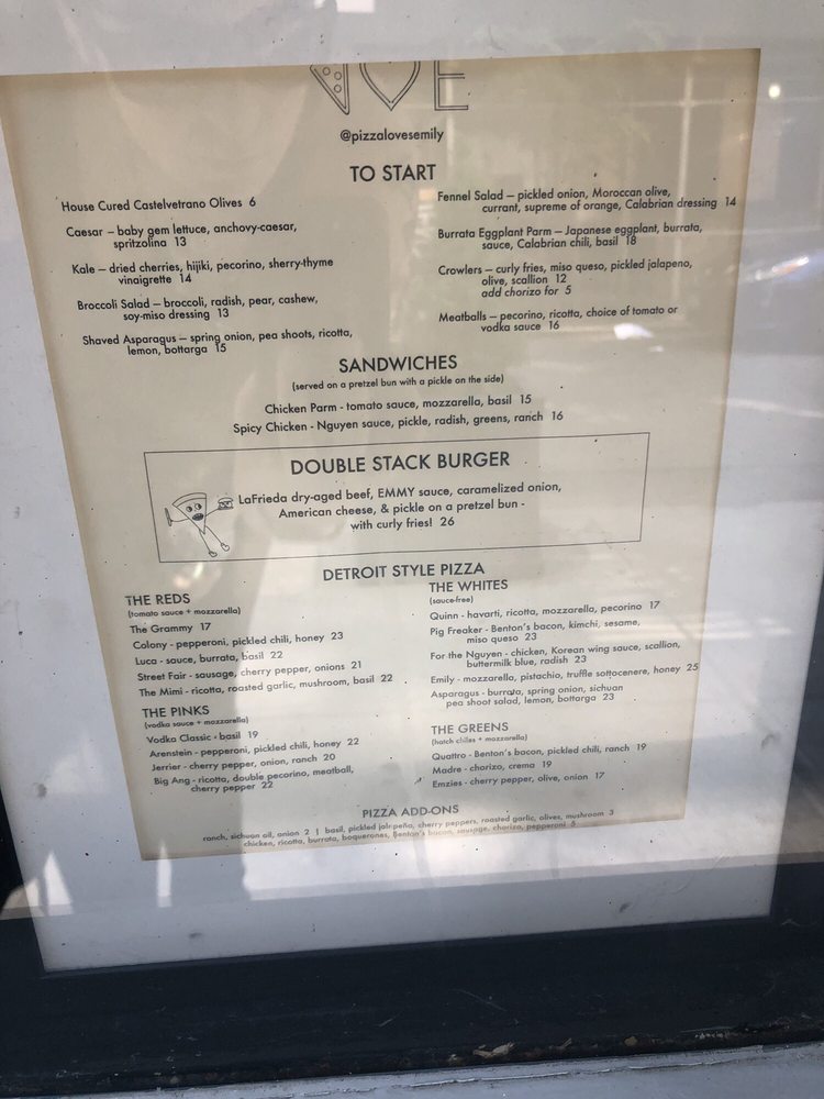 Introducing the menu at Emily - West Village, a trendy pizza and burger spot in New York City. With a variety of options, including vegan choices and a full bar, this restaurant offers a unique dining experience. The burgers are juicy and flavorful, with a standout bun texture, while the pizzas, like the vodka pie, are cheesy and satisfying. The cozy atmosphere is perfect for a group gathering, with friendly and attentive staff. Don't miss the waffle fries and the unique cocktails like the Perfect Pear. Make sure to reserve a spot and try the delicious baked ricotta dip. Emily - West Village promises a memorable dining experience with a blend of classic favorites and innovative dishes.